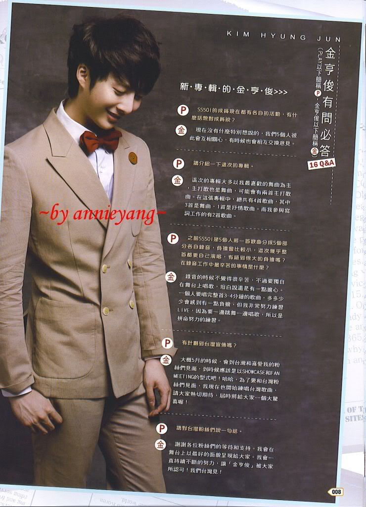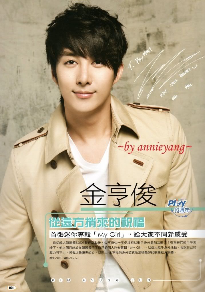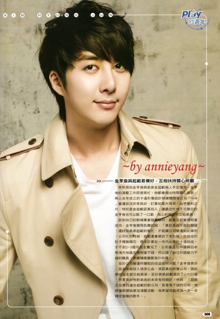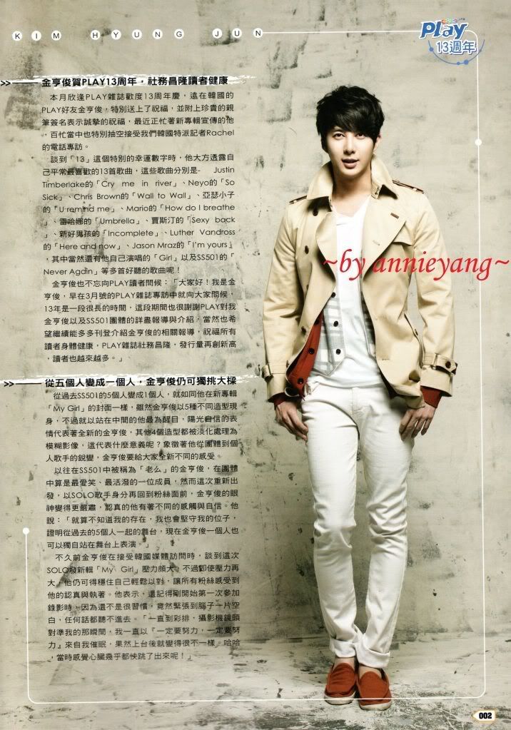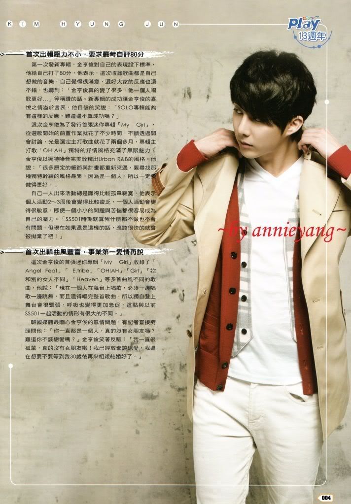 Desde que Kim Hyung Jun esta haciedo su carrera en solitario a parte del grupo SS501, su trabajo como artista se ha convertido en un desarrollo por varias areas. No solo ha tenido un gran éxito trabajando como protagonista en un musical, Cafe-In, lo que le ha proporcionado además un buen status como actor, sino que tambien ha estado muy ocupado con el negocio de diseño de personajes que ha iniciado junto a su hermano, Kim Kibum, al que han puesto un nombre formado con las iniciales de sus hombres, HnB.Sin embargo, a parte de todo esto, y ya que sus fans echaba de menos oirle cantar con su genial voz, desde que su primer album en solitario se puso a la venta en Marzo, se ha convertido en un gran tema de dicursion y con una gran popularidad en todo el mundo, y por ello él ha estado muy ocupado haciendo una gran promoción con diversas actividades. Sin mencioanr claro las muchas entrevistas que ya ha concedido, por lo que descnsar es para él ahora mismo algo que se puede considerar un lujo que no tiene. Finalmente el mes pasado, una de las reporteras de PLAY, Rachel, pudo conseguir por fin una entrevista con él y fue a Corea para tener la oportunidad de tener una entrevista y relizar además un exclusivo photoshoot. El amable y simpático Kim Hyung Jun respondió a tdoas las preguntas, con su forma natural de hablar y comportarse haciendo que hasta nuestra redactora Rachel cayese enamorada de él, ¡se ha vuelto su fan despues de haberle hecho la entrevista!
