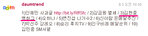 La noticia del abrazo de Kim Hyun Joong el Número 3 en Daum y en @daumtrend